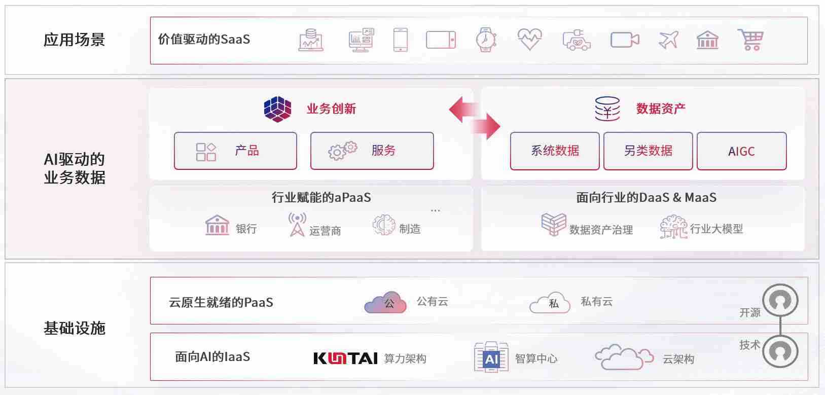 数字时代,,,,围绕企业数字化转型的关键要素,,糖心vlog数码开创性的提出数云融合战略和技术体系框架,,,,着力在云原生、、数字原生、、AI原生和信创产业上架构产品和服务能力,,,,为处在不同数字化转型阶段的快消零售、、、、汽车、、金融、、、医疗、、、、政企、、、、教育、、运营商等行业客户提供泛在的敏捷IT能力和融合的数据驱动能力,,,,构建跨界融合创新的数字业务场景和新业务模式,,助力企业级客户建立面向未来的核心能力和竞争优势,,,,全面推动社会的数字化、、、智能化转型升级。。